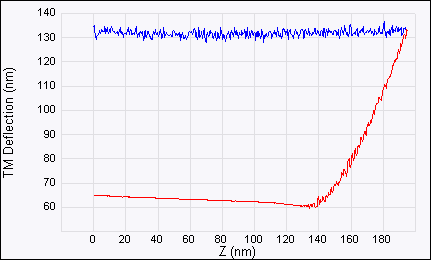 If the photo-detector does not have enough range to allow for the specified cantilever deflection, the indentation will fail. This commonly occurs because the zero vertical deflection level has drifted within the photo-detector’s range. The level of zero vertical deflection is the level of the flat/horizontal portion of the curve in the force plot. Since the Trigger threshold is measured relative to this zero deflection level, drift can cause decreased range for indenting.