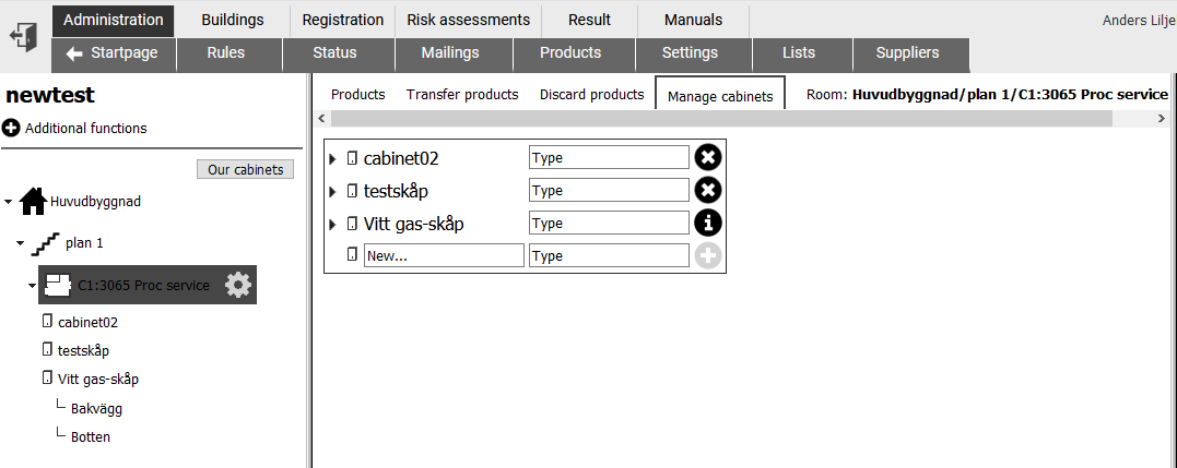 This will make the list of chemicals much shorter when you display the products residing in one cabinet or one shelf. It will give you a much better overview during inventory. See to it that a lab room entry is selected in the left column. Then there will be a tab "Manage cabinets" shown above the list of products. |