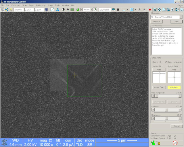 Sometimes the misalignment can be so large that the blob is not visible at all. Then you can try to adjust the "Source Shift" control as well, it is possible to make the blob visible this way. Then try to position it on the green cross by adjusting both "Source Shift" and "Source Tilt" without the "Modulator" activated. Although the adjustment will not be optimal, you can squeeze out some more lifetime of the FEG source before it has to be replaced. |